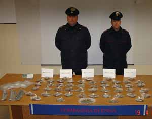 Leonforte. La scorsa notte poco prima della mezzanotte, nella zona industriale di Dittaino, i carabinieri della stazione di Leonforte in collaborazione con il nucleo operativo e radiomobile della compagnia di Enna, durante un mirato servizio volto alla repressione dello spaccio e del traffico delle sostanze stupefacenti, scaturito da lunghe ed accurate indagini, intercettavano e fermavano una macchina con a bordo due giovani leonfortesi provenienti da Catania. La perquisizione, che seguiva permetteva di rinvenire un grosso quantitativo di marijuana, circa 700 grammi. La sostanza ad alto contenuto di principio attivo, risultava confezionata in modo quasi industriale. Infatti, la busta principale ne conteneva a sua volta 5, all’interno delle quali erano ben riposti e sigillati 10 sacchetti contenenti ognuno 15 grammi circa di stupefacente, per un totale di 50 sacchettini. La sostanza vista l’alta qualità avrebbe fruttatato al dettaglio quasi 10.000 euro. Successive perquisizioni hanno permesso ai militari di sequestrare svariati materiali utili al confezionamento tra cui spicca una bilancia elettronica di ultimissima generazione capace di pesare la sostanza al milligrammo.