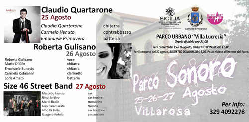 Secondo ospite è Roberta Gulisano giovane cantautrice ennese che sta scalando la notorietà segnalandosi in tutte le manifestazioni cui partecipa e riscuotendo premi per i suoi testi e per le musiche, un’artista da non perdere di vista; terzo ospite è l’allegra brigata dei Size 46 Street Band ovvero riprendendo l’antichissima tradizione del Dixieland di New Orleans la piccola banda animerà le vie di Villarosa e poi si esibirà sul palco dell’Anfiteatro. Tutti gli spettacoli avranno inizio alle ore 21, apertura botteghino ore 20.00.