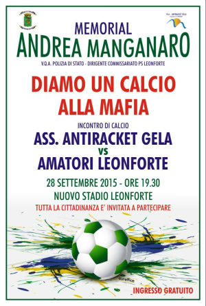 Leonforte. Si disputerà lunedì 28 settembre, alle 19.30, nel nuovo Stadio Comunale di Via Don Bosco, l’incontro calcistico “Memorial Andrea Manganaro – Diamo un calcio alla mafia” tra una rappresentativa di atleti locali “Amatori Leonforte” e una squadra di rappresentanti dell’Associazione Antiracket di Gela.