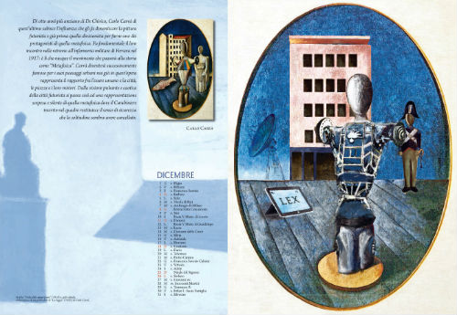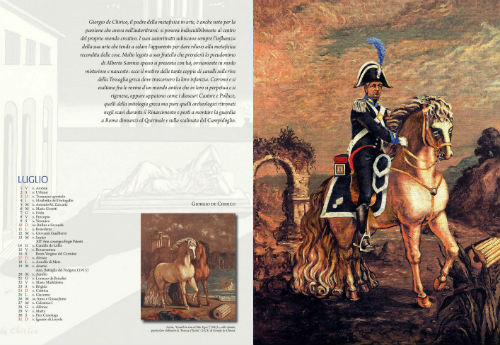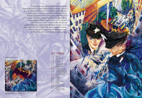 “Il percorso immaginario delle tavole del Calendario interpreta l’evoluzione dell’Arma dei Carabinieri nel tempo, disancorato dalla rigidità cronologica delle opere. Parte da Giovanni Boldini, con una composizione intima, evocativa di un momento storico ottocentesco, nella quale, alla giovane donna e al figlio dipinti dall’artista, si affianca la figura caratteristica di un Carabiniere, marito e padre, espressione di eleganza e di composta proprietà formale. Con Amedeo Modigliani, l’operazione assume dimensioni quotidiane: le sue figure esili e allungate, che esaltano tutti i valori umani, ci riconducono alla bellezza e alla semplicità delle forme tipiche dell’arte rinascimentale. Nelle tinte forti di Henri de Toulouse-Lautrec è stato incastonato l’elemento uniformologico più caratterizzante del Carabiniere, il mantello foderato di rosso, coincidente con una lettura fatta già negli anni ‘20 del secolo scorso dalla rivista “L’Arma Fedele”: nella cornice di una riunione mondana il Carabiniere assiste impassibile alla coinvolgente festosità. La figura del Maresciallo, attento e paterno tutore del territorio, con i colori intensi della campagna e i protagonisti della serena vita di provincia, caratterizza invece i personaggi e le atmosfere di Vincent Van Gogh. Ecco, poi, il musicante visto col candore arcaico di Henri Rousseau. Quindi, la pattuglia che vigila sul tranquillo pomeriggio festivo della gente, come concepito da Georges Seurat. Per Giorgio De Chirico, una scelta che certo sarebbe piaciuta anche a lui: nelle vesti di un Generale dei Carabinieri dell’800 è lo stesso pittore in sella ad uno dei suoi cavalli riccioluti, un autoritratto virtuale che va ad aggiungersi ai tanti da lui dipinti nel corso degli anni, in costume da torero o da gentiluomo del settecento. Nella doppia pagina centrale la già citata opera “I papaveri” di Monet, uno dei massimi rappresentanti dell’Impressionismo, è rivisitata, come detto, con la semplice aggiunta di una pattuglia di Carabinieri, la cui presenza appare protettiva e rasserenante. Con Salvador Dalì solleviamo i piedi da terra e ci portiamo con la fantasia al livello del Surrealismo; la pittura del grande artista spagnolo è sembrata la più valida a essere coniugata, nella chiave delle sue invenzioni oniriche, con la figura del Carabiniere sposata al concetto dell’eroismo a difesa dei cittadini. A seguire, una serie di tavole ispirate alle opere degli eredi della Scapigliatura, i Futuristi, che si proponevano di adeguare ogni espressione d’arte al dinamico divenire della civiltà industriale e delle sue città. Il “trionfante progresso delle scienze” ha trovato la sollecita risposta dell’Arma dei Carabinieri che, da allora, ha ancor più dato slancio allo sviluppo delle proprie strutture, con l’adozione di sempre nuovi procedimenti, strumenti e mezzi operativi. Il vivace dinamismo è rievocato, in queste pagine, con le successive interpretazioni dell’aderenza e della tempestività dell’azione dell’Arma. Ecco, quindi, la caotica realtà metropolitana di Umberto Boccioni che, nella rivisitazione, si svolge sotto lo sguardo amico, protettivo e vigile di due Carabinieri, cui seguono le immagini, dipinte nel tipico stile futurista, di un’autoradio e di un Carabiniere motociclista, tratte da un’altra opera di Balla e da una di Mario Guido Dal Monte. Conclude Carlo Carrà, il più ermetico, ma anche il più discretamente simbolista della pittura italiana: al suo stile è affidata l’evocazione di un’Arma che, dotata dei mezzi della modernità, opera nel presente e guarda al domani con il saldo spirito di sempre”.