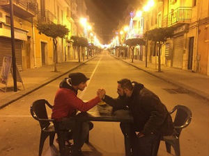 I commercianti contenti per l’accaduto hanno deciso di chiudere anticipatamente per festeggiare l’enorme incasso della serata con svaghi giovanili e meritato riposo! #leonforte #isolapedonale #simucunsumati #crisieconomica #vanuacadirimanu”.