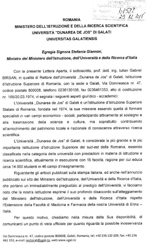 Il rettore dell’università romena Dunarea de Jos che ha aperto ad Enna una estensione della facoltà di Medicina e Farmacia, Iulian Gabriel Birsan, ha scritto una lettera aperta al ministro dell’istruzione Stefania Giannini per chiedere un incontro che chiarisca gli aspetti giuridico accademici che condizionano, secondo il ministero, la legalità del funzionamento della facoltà in Italia Secondo il rettore la campagna di stampa dopo la comunicazione del ministro, che aveva definito l’iniziativa di Enna“ fuorilegge” ha danneggiato l’immagine della università romena, tra le più prestigiose del sud est della Romania. “Vi chiediamo, si legge ancora nella lettera al ministro –di comunicarci la base legale con la quale avete qualificato l’estensione della facoltà di Medicina e Farmacia come illegale”.