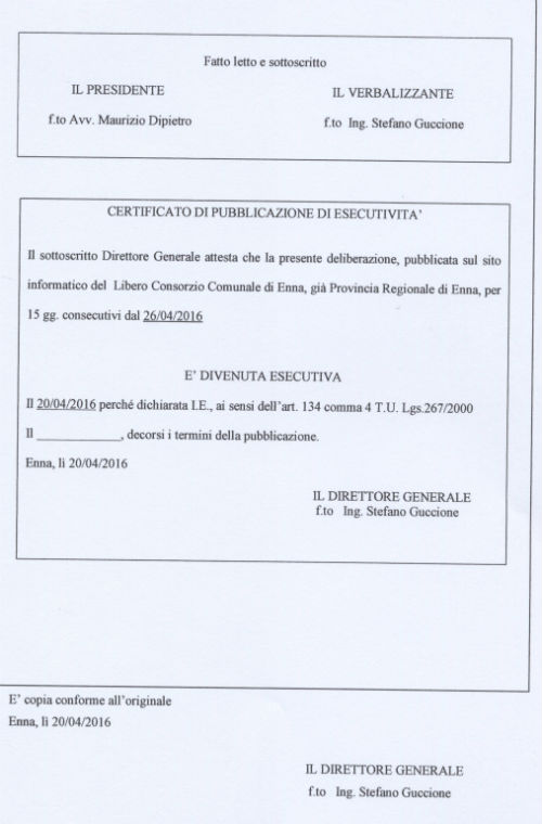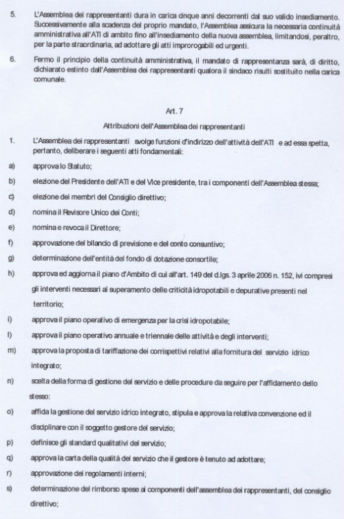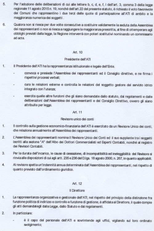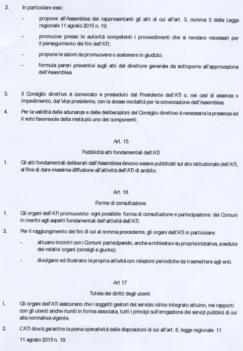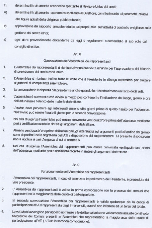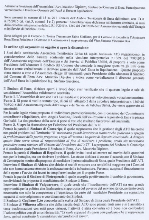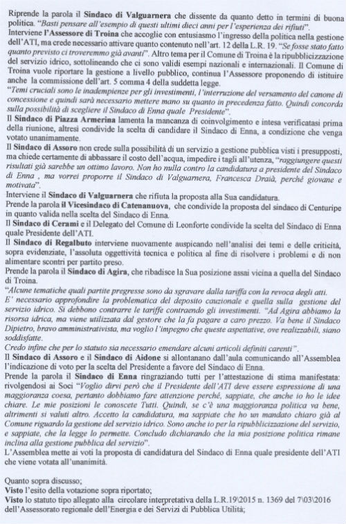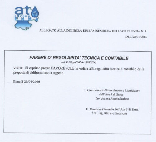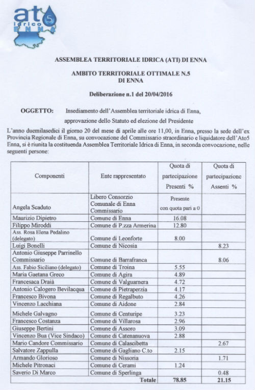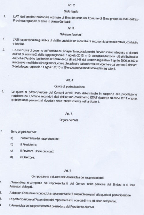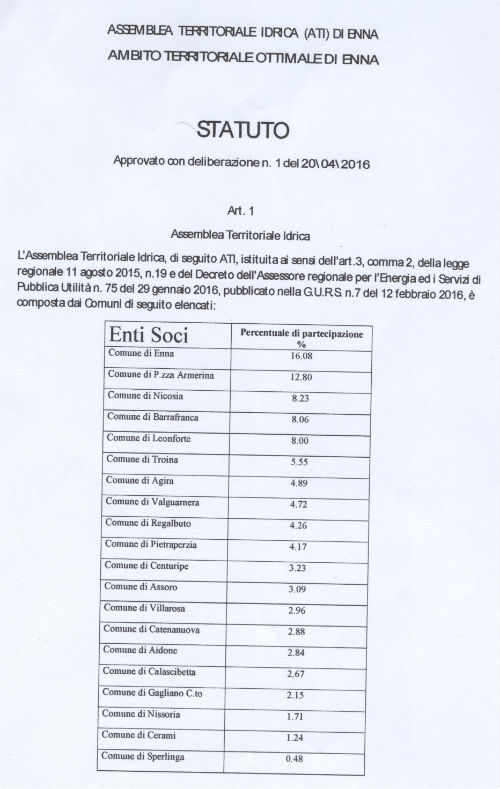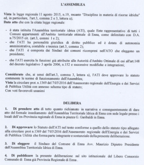 Nonostante i dubbi palesati nell’ultima assemblea da parte di qualche sindaco l’impianto normativo regionale appare abbastanza univoco nel ritenere che l’ATI, assemblea territoriale idrico, è stato di diritto costituito per legge, è dotato di una propria personalità giuridica. Benché l’ATI sia stata costituita ex-legge, la stessa doveva insediarsi formalmente: e ciò è avvenuto ad Enna in data 20.04.2016, con delibera che si allega e si è auto organizzata, approvando il relativo statuto, allegato, che all’art. 3 c.2 ne regolamenta funzioni e poteri. In tal senso varie sono state le circolari dell’assessorato regionale dell’energia e dei servizi di pubblica utilità (07.03.2016, 07.11.2016 e 22.11 2016), a firma dell’assessore dott. Vania Contraffatto che onerava i comuni di ciascun ambito territoriale a porre in essere tutti gli adempimenti necessari al formale insediamento dell’ATI.