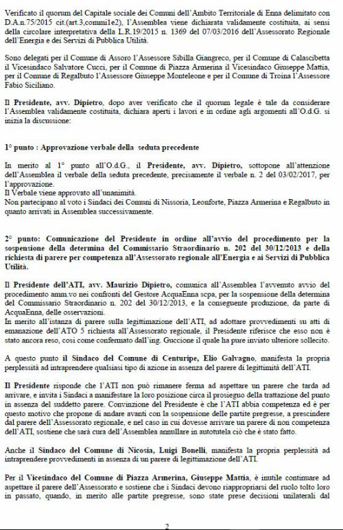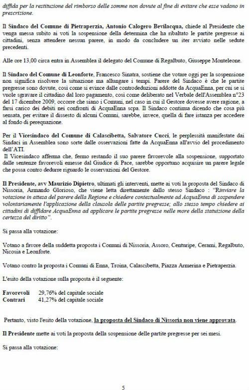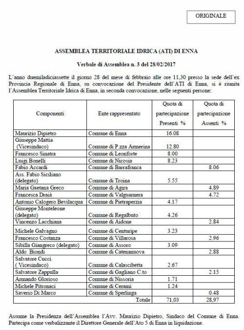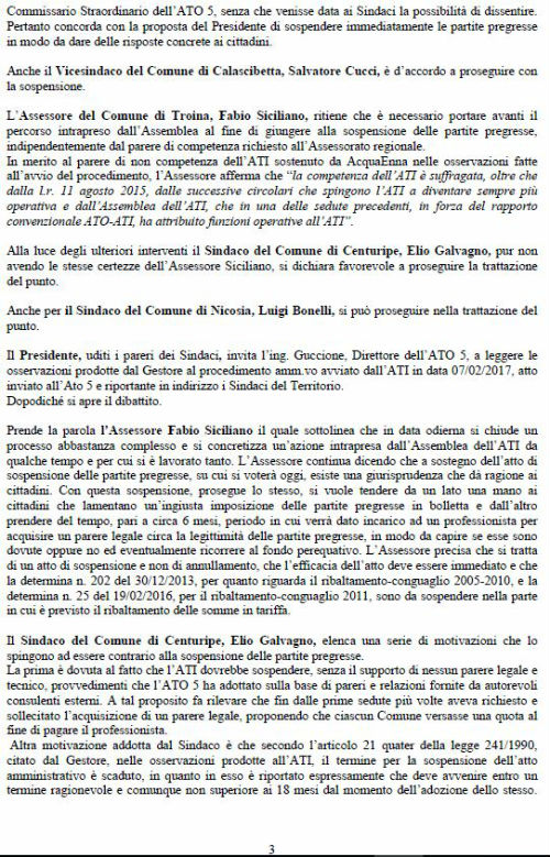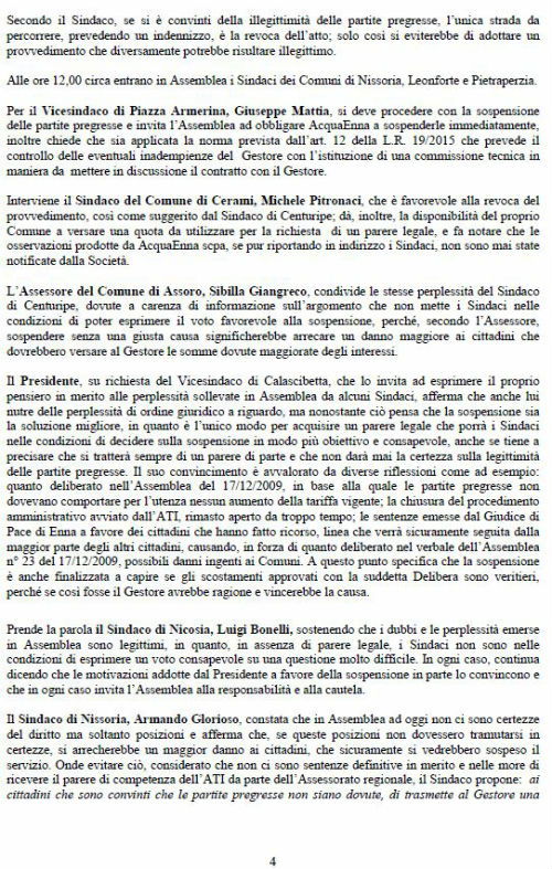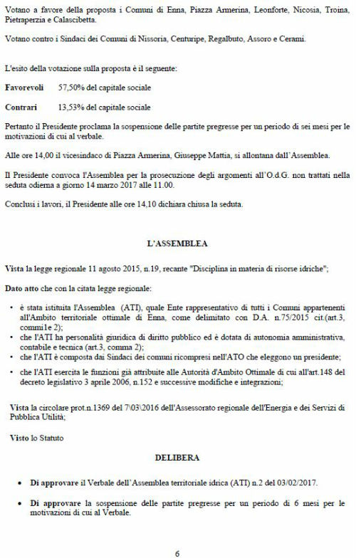 Era precisamente l’8 marzo del 2016 data in cui Assoconsumatori – Asso-Consum chiese con protocollo 550 dell’ATO, oggi ATI, la sospensione delle partite pregresse, trasmesse per conoscenza a tutti i sindaci, sulla base dei pronunciamenti dei giudici. I Giudici di Pace, IN NOME DEL POPOLO ITALIANO sentenziano dando ragione ai consumatori e condannando Acquaenna alla restituzione delle somme illegittimamente esatte e al pagamento delle spese processuali. Finalmente dopo un anno i Sindaci dopo diversi aggiornamenti di seduta e dopo tentativi maldestri, per non decidere, di acquisizione di pareri dell’assessorato regionale sulla possibilità da parte dell’ATI di sospendere le partite pregresse, inutili, a nostro giudizio, visto lo statuto dall’ATI approvato dagli stessi sindaci meno di un anno fa, in cui all’articolo 3 c.2 veniva stabilito che l’ATI sostituisce in tutto e per tutto l’ATO idrico ormai in liquidazione. L’assemblea dei sindaci riunitasi in data 14 marzo 2017, erano presenti tutte le rappresentanze dei comuni, approvano il verbale n.3 del 28.02.2017, reso immediatamente esecutivo, sospendendo per sei mesi la bollettazione delle partite pregresse. Per tranquillizzare i dubbiosi è notizia che, ancora l’altro ieri un Giudice di Pace ha sentenziato che le partite pregresse del sig. T.S. di Aidone non sono dovute e condanna Acquaenna alle spese processuali. Sembra, poi, oltremodo strano che in correlazione a quanto è stato deliberato dai sindaci facciano seguito, come da nota del direttore generale di Acquaenna, perplessità sulla gestione futura della società, con timore per l’occupazione del personale. Sembra il ripetersi di un copione che l’associazione ha già vissuto quando nel 2006 si pose il problema delle illegittimità nell’affidamento del servizio e le delibere di determinazione delle tariffe 2006 e 2007 con sentenza de CGA n. 48/09 e della successiva ordinanza della Cassazione. Non vorremmo che l’aver sollevato l’illegittimità delle somme richieste agli utenti, a titolo di partite pregresse, conclamata dalle sentenze dei Giudici di Pace e ritenuta fondata, dall’assemblea dei sindaci, che per tale ragione hanno deciso la sospensione, innescasse il meccanismo già vissuto negli anni 2006/ 2010 allorché si pensò bene di alimentare ad arte un conflitto sociale tra i cittadini della provincia di Enna (180.000) ed i lavoratori delle società che gestiscono i servizi pubblici. Non ci faremo intimidire da chi pensa di utilizzare i lavoratori per i propri scopi. Manifestiamo solidarietà ai lavoratori, che non percepiscono lo stipendio, evidenziando le proprie perplessità sulla strana coincidenza degli eventi: decisione dei sindaci di sospendere le partite pregresse, preoccupazione della dirigenza di Acquaenna sul mantenimento dei livelli occupazionali. E’ ora che chi ha sbagliato paghi, magari andando a verificare le procedure di aggiudicazione della gara, ove risiedono tutti gli errori che si vorrebbero far pagare agli ignari cittadini. Si allega verbale della seduta del 28.02.2017