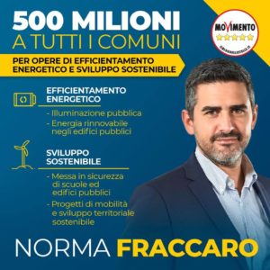 Il senatore del Movimento 5 Stelle, Fabrizio Trentacoste, annuncia l’arrivo dei fondi stanziati dalla Norma Fraccaro, inserita nel Decreto Crescita, per tutti i comuni italiani, per un totale di 500 milioni di euro, da investire in opere di efficientamento energetico e sviluppo sostenibile.
