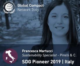 “Il lavoro svolto da Francesca Martucci s’inquadra nel più ampio piano strategico e d’azione sulla sostenibilità di Pirelli, che aderisce dal 2004 all’UN Global Compact ed è ‘fondatore’ del network italiano. La candidatura presentata dall’azienda dimostra come una giovane risorsa possa contribuire in modo significativo al successo dell’organizzazione di cui è parte, su temi cruciali e strategici”, ha detto Marco Frey – presidente del Global Compact Network Italia – commentando l’assegnazione del riconoscimento. “Con i suoi sforzi e il suo impegno quotidiani, la prima SDG Pioneer italiana ha sicuramente ispirato altri attori, interni ed esterni all’Azienda. Anche per questo motivo, abbiamo scelto di riconoscere il suo operato attraverso il concorso”. Come vincitrice del round nazionale, Francesca Martucci parteciperà alla competizione globale dove sfiderà altri candidati per provare a conquistare il titolo di UN Global Compact SDG Pioneer 2019. I vincitori globali saranno annunciati durante l’Assemblea Generale delle Nazioni Unite che si terrà a New York nel mese di settembre.