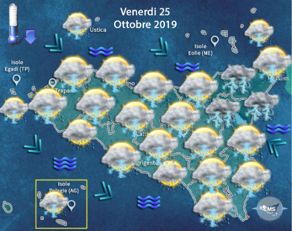 Condizioni: forte maltempo durante la notte e al primo mattino su palermitano (specie settore centrale e orientale), Sicilia centro-orientale e meridionale,, messinese centrale, nord del catanese con temporali intensi che potranno assumere localmente carattere grandinigeno. Si attenuano i fenomeni altrove anche se permarrà instabilità sparsa. Nella tarda mattinata e il primo pomeriggio il maltempo si accanirà sul messinese ionico (possibile parziale ombra su area dello Stretto di Messina) e nord del catanese; in queste aree i fenomeni assumeranno carattere di nubifragio con accumuli ingenti. Piogge e rovesci sparsi altrove mentre giungeranno schiarite sul settore meridionale e a tratti su quello occidentale. Migliora in serata con possibili fenomeni circoscritti al settore centro-settentrionale.