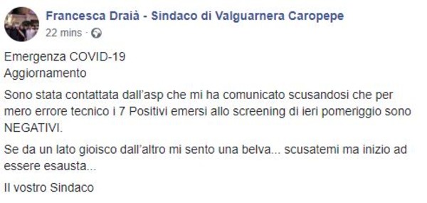 L’Asp prima comunica che i 7 tamponi dei piccoli alunni valguarneresi processati sabato prima col sistema rapido e poi molecolare risultano positivi, salvo poi correggere il tiro e puntualizzare che sono negativi. A raccontare la situazione paradossale venutasi a creare la sindaca Francesca Draià: “Alle 15,07 attraverso pec – afferma la sindaca – ho ricevuto comunicazione dell’Asp che confermava la positività dei 7 tamponi dei bambini, processati sabato pomeriggio col sistema rapido e confermati stamattina dal molecolare. Mi adopero, per precauzione, a chiudere sino al 20 gennaio le scuole, in attesa che domani lunedì venissero effettuati i tamponi agli alunni rimanenti. Mi affretto a darne comunicazione, tramite video messaggio alle famiglie, quando verso le 18 mi chiama una mamma di uno dei bambini implicati, comunicandomi di aver ricevuto comunicazione dall’Asp della negatività del proprio figliolo. Rimango senza parole e mi affretto a ricontattare un medico dell’Asp il quale scusandosi, mi riferisce che era stato commesso un errore tecnico, per cui i 7 bambini risultavano tutti negativi. Sono rimasta basita e senza parole. Nel sentirmi dentro di me contenta nell’appurare che i bambini sono tutti negativi e che le famiglie coinvolte possano ritrovare serenità, rimango sbigottita per un simile errore. Nello scusarmi per un errore così marchiano da me certamente non commesso, comunico che domani lunedì le scuole rimarranno chiuse”. Che dire, com’è possibile commettere simili errori da parte di una azienda sanitaria pubblica che dovrebbe dare certezze? Una assurdità che non trova giustificazioni.