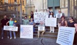 Fedeli escono dalla chiesa, cartelli contro i silenzi della Curia sugli abusi