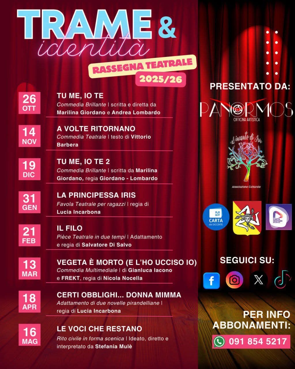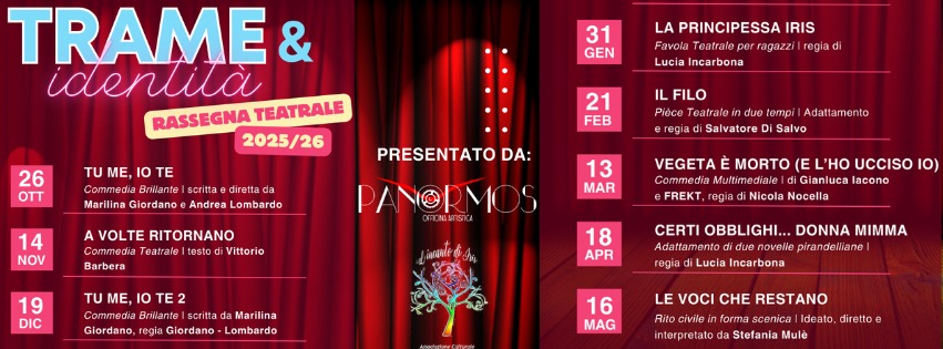 Palermo, 10 ottobre 2025 – Un gesto improvviso, una battuta che taglia il silenzio e somiglia a qualcosa che ci portiamo dentro, un’emozione mai espressa che, all’improvviso, qualcuno ci restituisce dal palco. “Trame e Identità”, la rassegna teatrale 2025-26 di Panormos Officina Artistica in collaborazione con L’Incanto di Iris, nasce così, come un mosaico di vite che si intrecciano sul palco, fatte di sogni mancati, famiglie strambe, risate e solitudine.