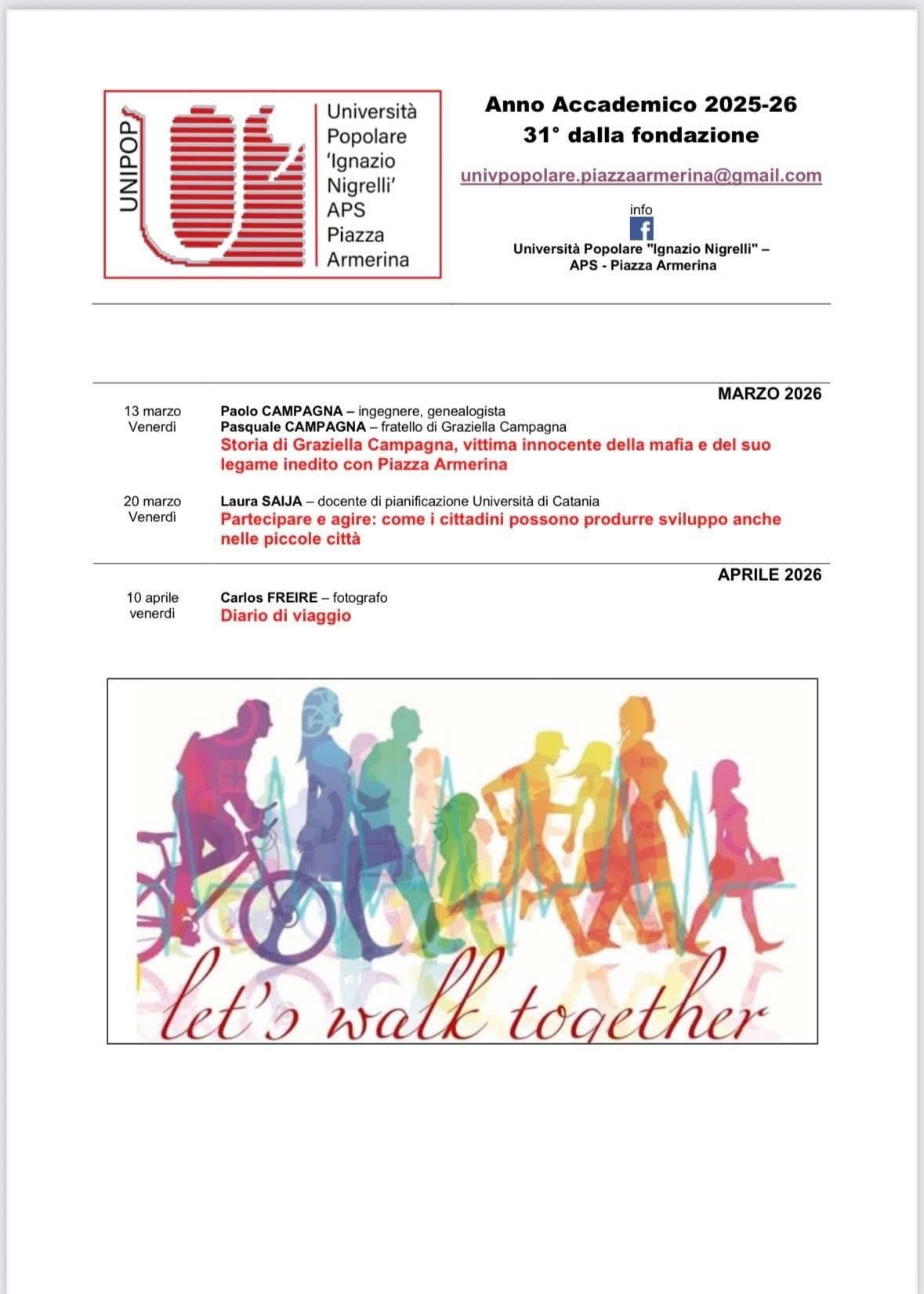 PIAZZA ARMANNA- “In un mondo che corre, fermati a pensare con noi”. Questo lo slogan che annuncia il programma del 31° anno accademico dell’UniPop “Ignazio Nigrelli” – APS, “Università Popolare Ignazio Nigrelli”. Il nuovo programma è la conferma dell’impegno che ha consentito all’associazione, in tutti questi anni, di assumere un ruolo centrale nel welfare culturale della città.