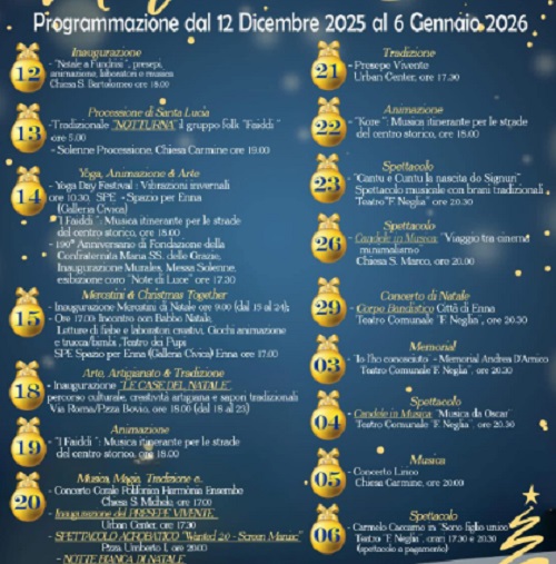 In effetti, del cartellone ennese c’è traccia nella pagina Facebook dell’assessore agli Spettacoli, Mirko Milano, che, praticamente, dall’inizio del mese, ricorda gli appuntamenti natalizi. Tra i più recenti si segnalano il presepe vivente all’Urban center, tenutosi il 21 dicembre; l’indomani la musica itinerante per le strade del centro storico, il 23 lo spettacolo al Neglia “Cantu e Cuntu la nascita do Signuri”.