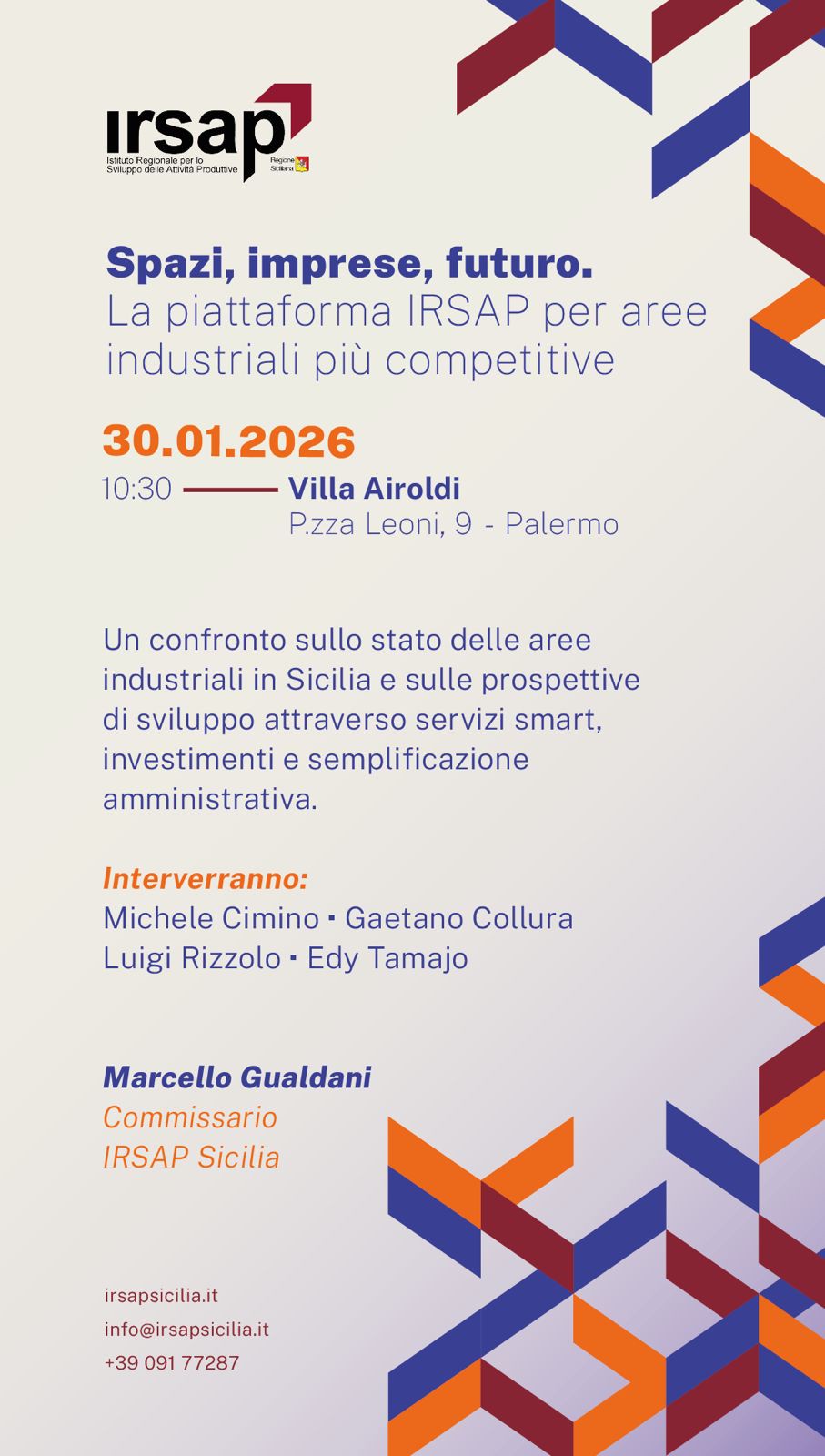 Palermo – Digitalizzazione dei servizi, nuova governance delle aree industriali e strumenti innovativi per sostenere le imprese. Sono questi i temi al centro dell’incontro promosso da IRSAP – Istituto Regionale per lo Sviluppo delle Attività Produttive, in programma venerdì 30 gennaio alle 10,30 a Villa Airoldi, a Palermo. Un appuntamento che si propone come momento di confronto concreto sul futuro delle aree produttive siciliane e sulle politiche industriali regionali.