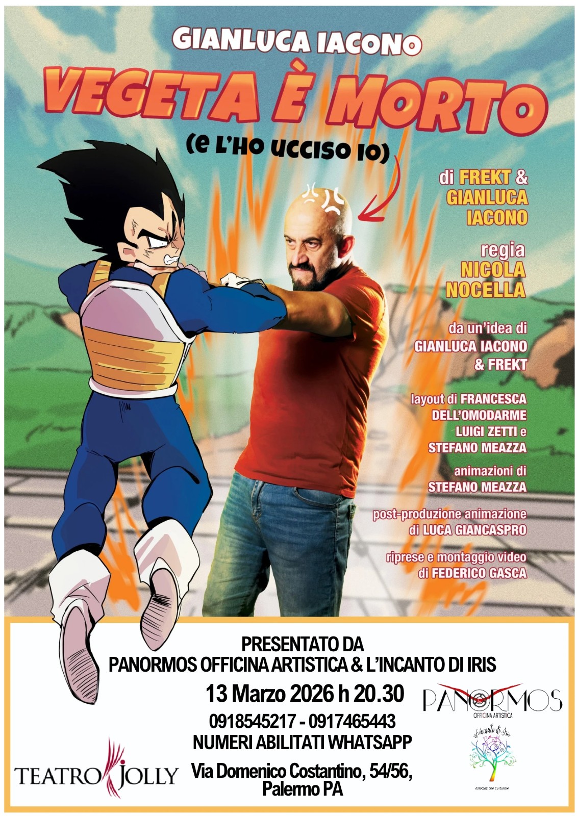 Una delle voci più celebri dell’animazione italiana arriva a Palermo. Venerdì 13 marzo 2026 alle ore 20.30 il Teatro Jolly ospita “Vegeta è morto (e l’ho ucciso io)”, lo spettacolo di Gianluca Iacono – storica voce italiana di Vegeta – scritto insieme a FREKT per la regia di Nicola Nocella.