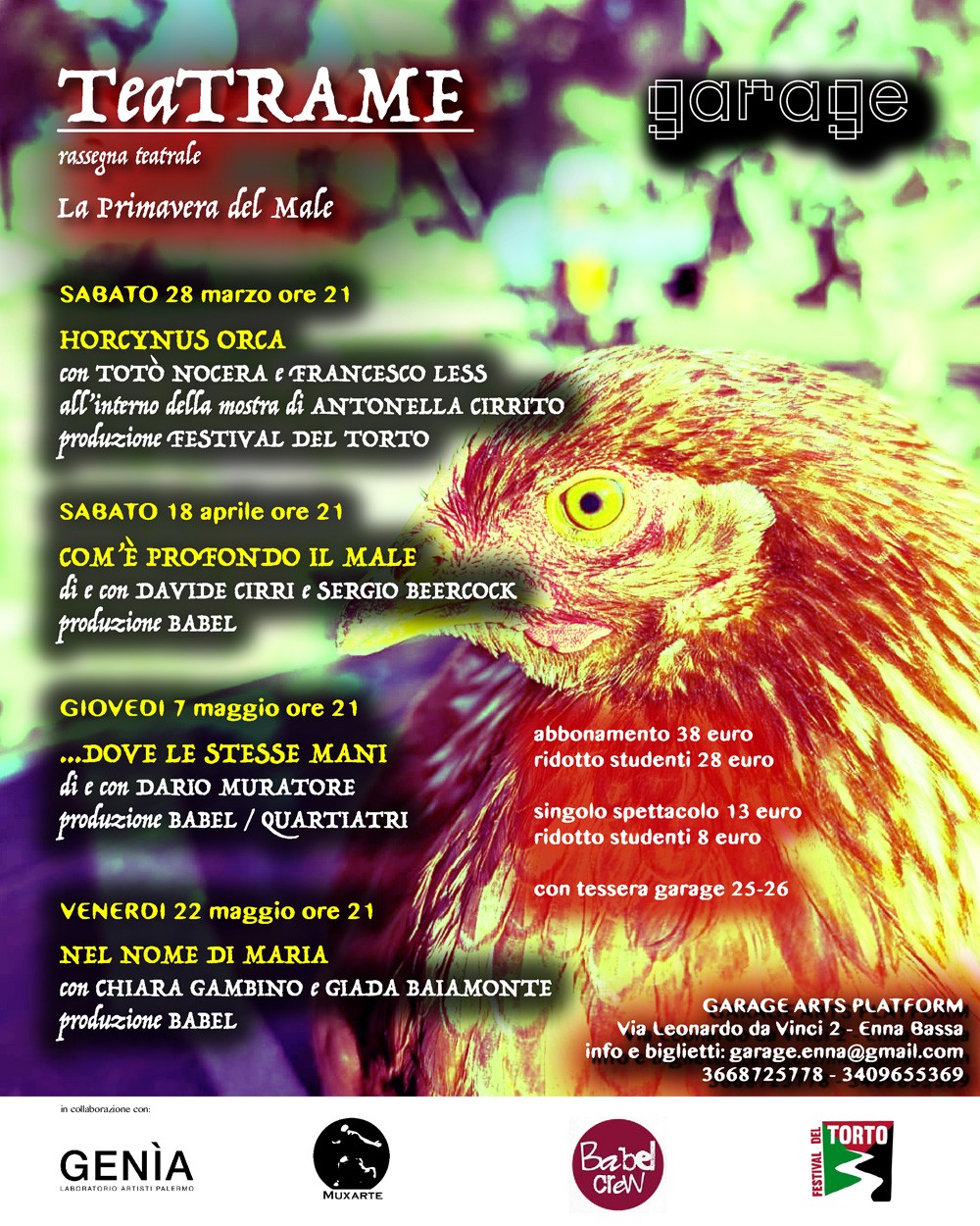Nelle prossime settimane durante la rassegna si esibiranno Sergio Beercock e Davide Cirri con “Com’è profondo il male” (18 aprile), Dario Muratore con lo spettacolo “…Dove le stesse mani” (7 maggio), Chiara Gambino e Giada Baiamonte con “Nel Nome di Maria” (22 maggio). Il Garage Arts Platform si trova in via Leonardo da Vinci 2 a Enna Bassa.